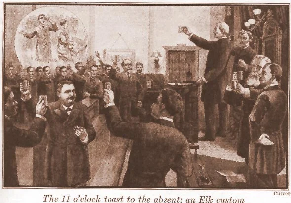 11 O'Clock Toast to the Absent: The hour of 11 has a special significance to Elks. Wherever Elks may roam, whatever their lot in life may be, when this hour tolls upon the dial of night, the great heart Elkdom swells and throbs. It is the golden hour of recollection, the homecoming of those who wander, the mystic toll call of those who will come no more. Living or dead, an Elk is never forgotten, never forsaken. Morning and noon may pass him by, the light of day sink heedlessly in the west, but ere the shadows of midnight shall fall, the chimes of memory will be pealing forth the friendly message: --- A Toast to Our Absent Members!